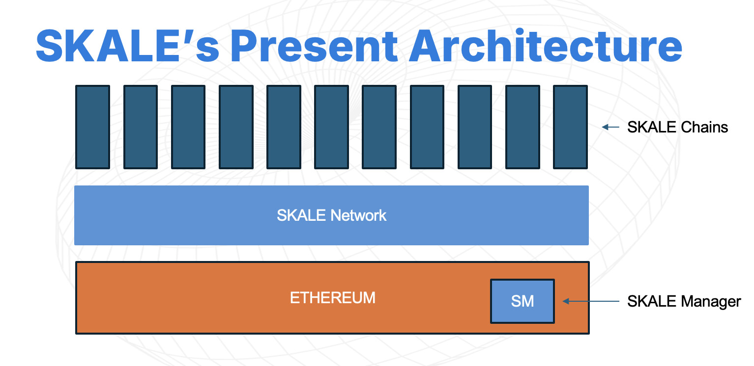 The SKALE Manager is a set of smart contracts that orchestrates and secures the SKALE network. These contracts live on Ethereum. This also means that the chains are directly connected to Ethereum. Stake for the network lives on Ethereum and more.